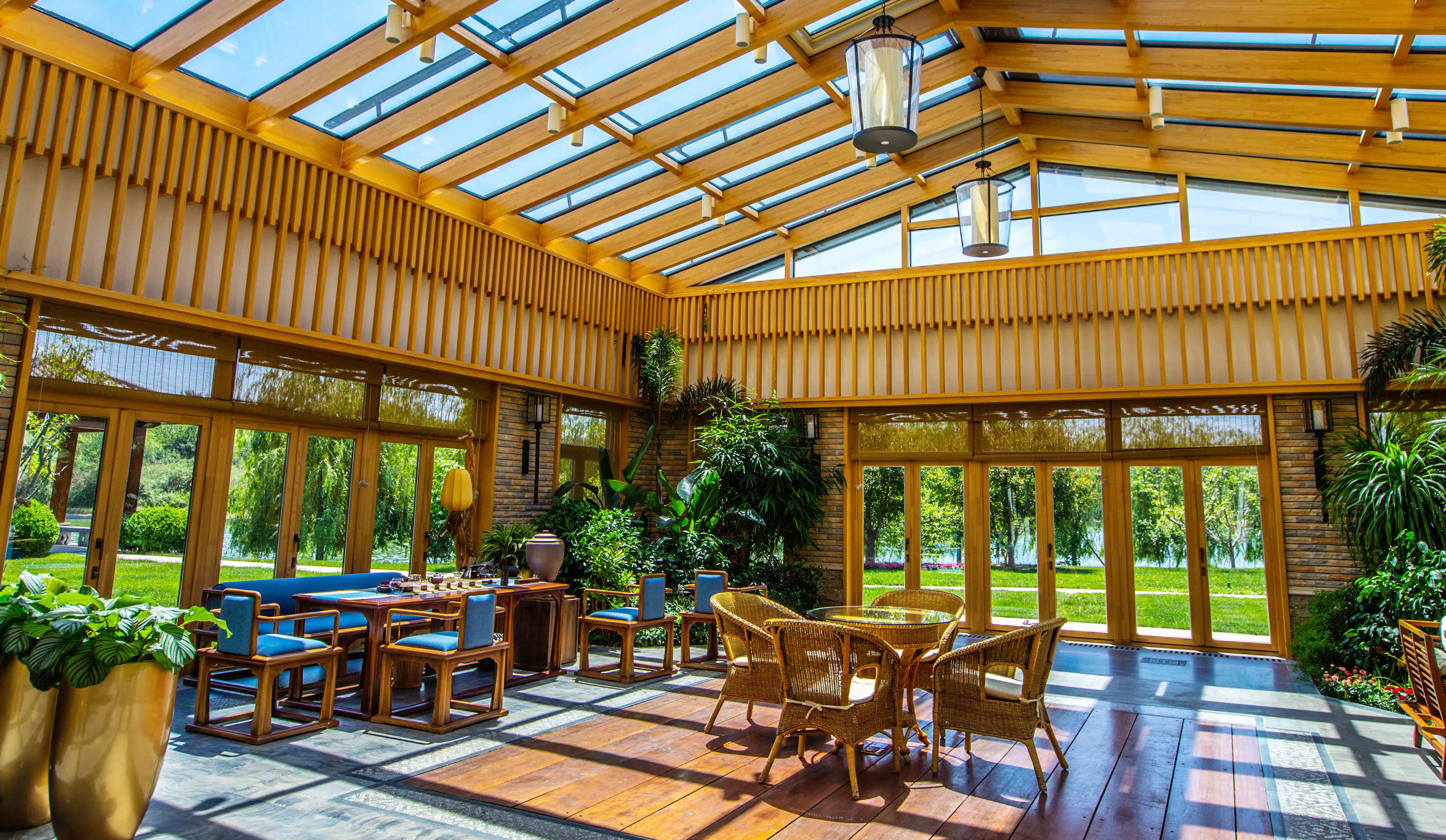 陽光房的造型為人字型,為提高舒適度,我們在頂部配置了側滑式天窗和遮陽卷簾,全部實現智能控制。關于陽光房的燈飾配套,我們擁有比較成熟的設計理念,選擇什么樣的燈飾,營造怎樣的光景,更符合建筑的審美及居室環境的再造,我們已形成了一套成熟的解決方案。