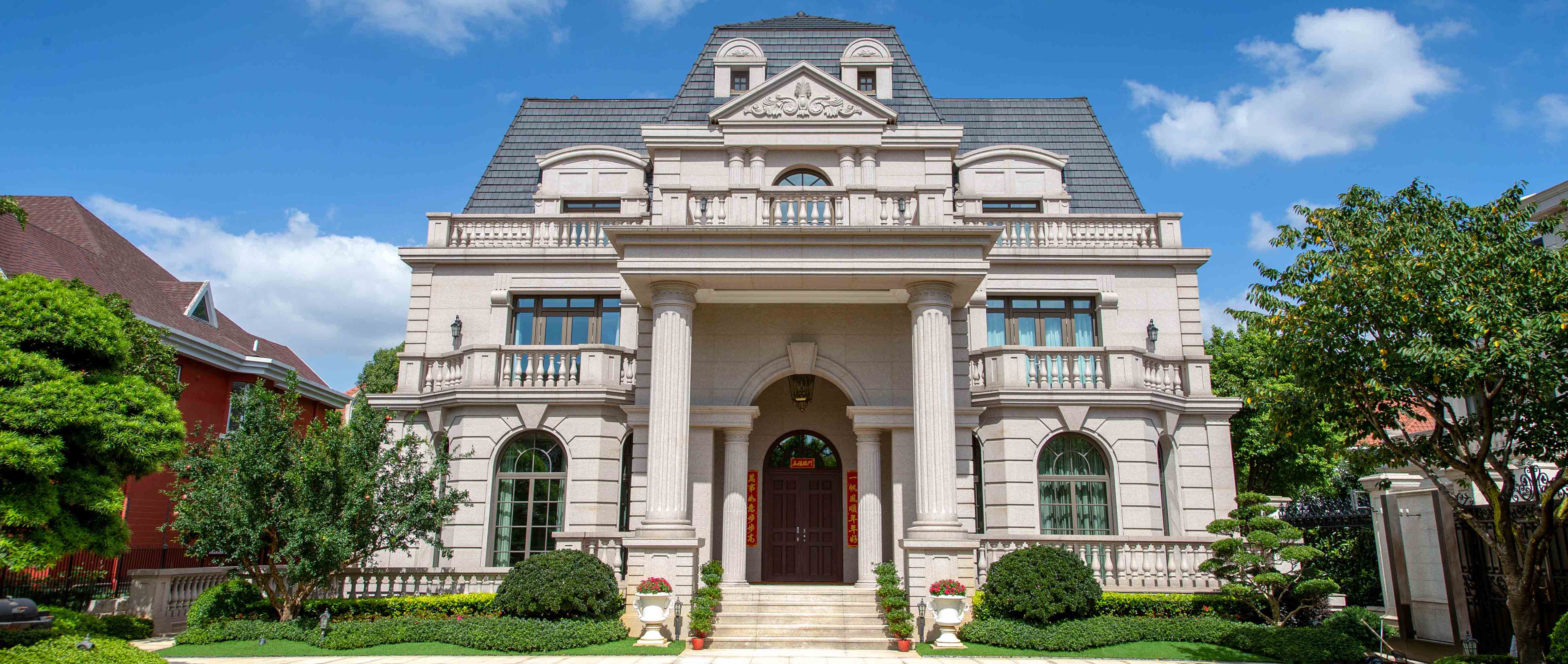 該別墅項目外墻選用進口萊姆石,質地精良,精雕細刻,盡顯王者之氣。進口日本黑松、羅漢松與本土樹種參差搭配,賞心悅目,襯托出一片祥和與寧靜。作為德國高端定制門窗與陽光房系統供應商,漢斯諾克充分發揮技術優勢,并邀請德方設計師全程參與,應用超大弧形窗、T型陽光房等經典造型,與建筑園林完美結合,融為一體,步移景換,彼此呼應,使建筑本身的美學價值卓然出眾。